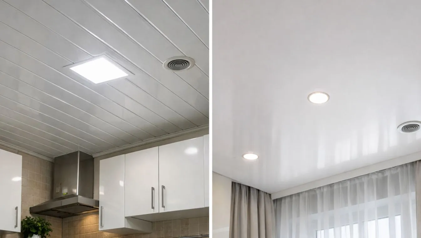 В наше время существует несколько самых распространенных вариантов отделки потолка — натяжные потолки, отделка гипсокартоном, побелка/покраска, подвесные потолки типа «Армстронг», реечные металлические потолки, ну и, пожалуй, плитка.